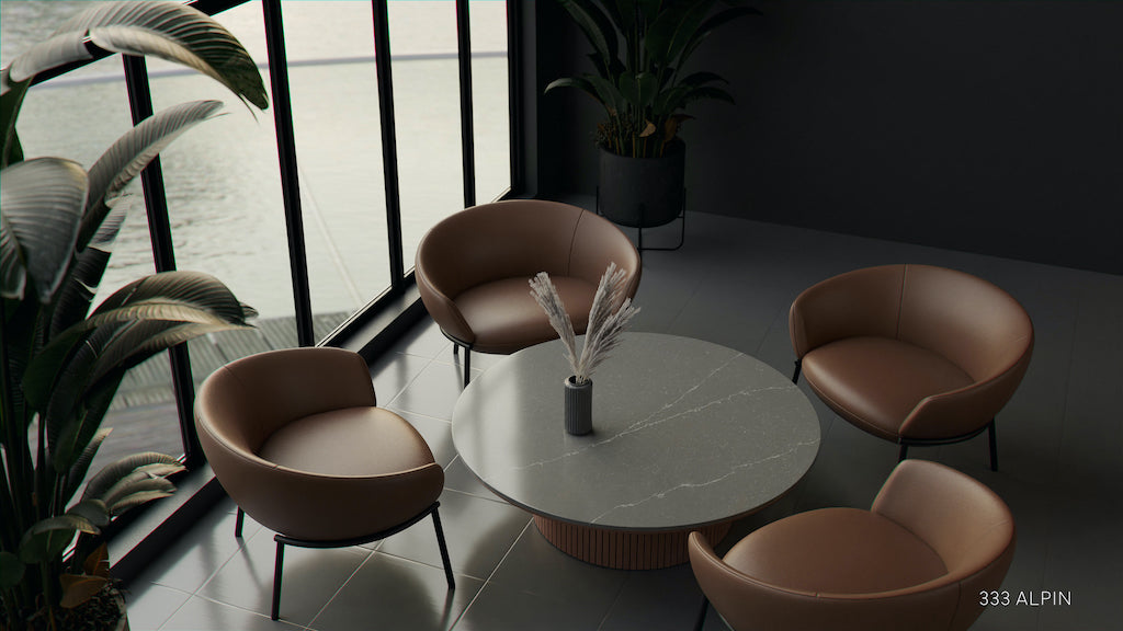 ALPIN este un quartz din colectia EXCLUSIVE a producatorului Cimstone, cu aspect tip marmura calacatta, avand o suprafata lucioasa si stralucitoare, fond gri brazdat de venaturi alb-gri light subtile, lungi si subtiri.