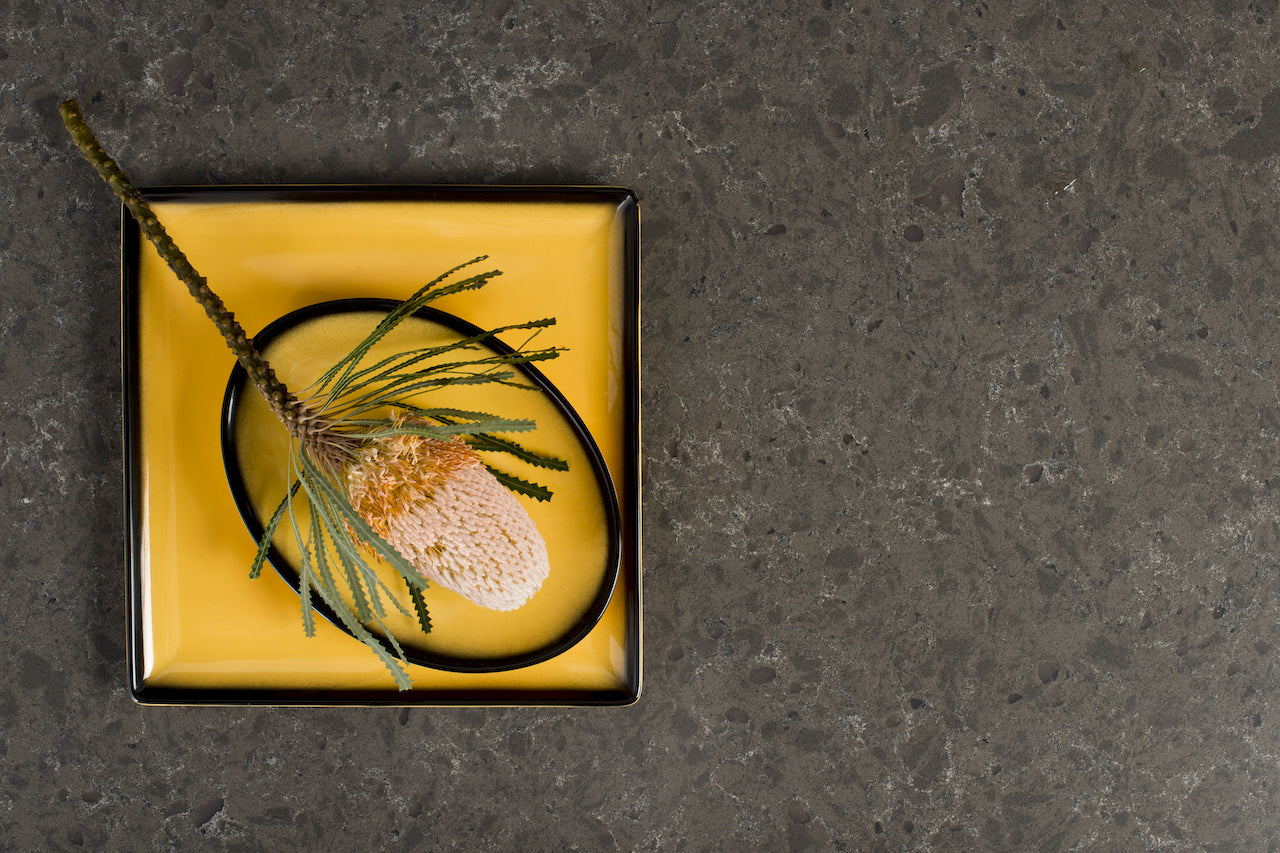 BABILON este un quartz compozit de culoare gri antracit cu aspect asemanator granitului natural, suprafata in finisaj lucios brazdata de o venatura subtila in tonuri mixate de gri-alb.