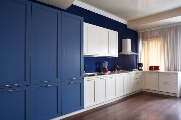 Mobilier bucatarie clasic, cu fronturi din MDF vopsit frezat, culoare in combinatie alb si albastru.